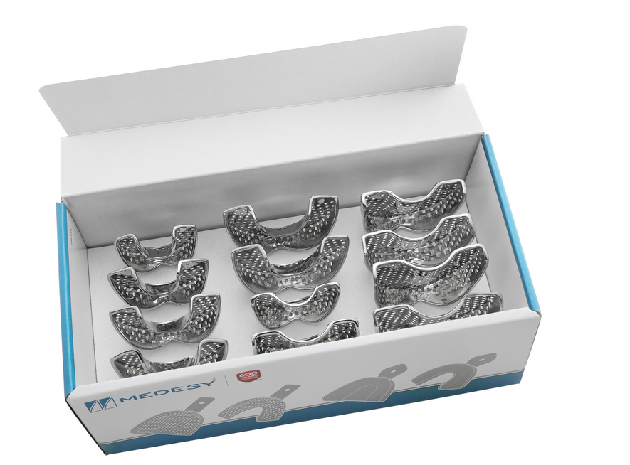 Conditionnement : le kit de 12 portes-empreinte (6 tailles en maxilaire et 6 tailles en mandibulaire)